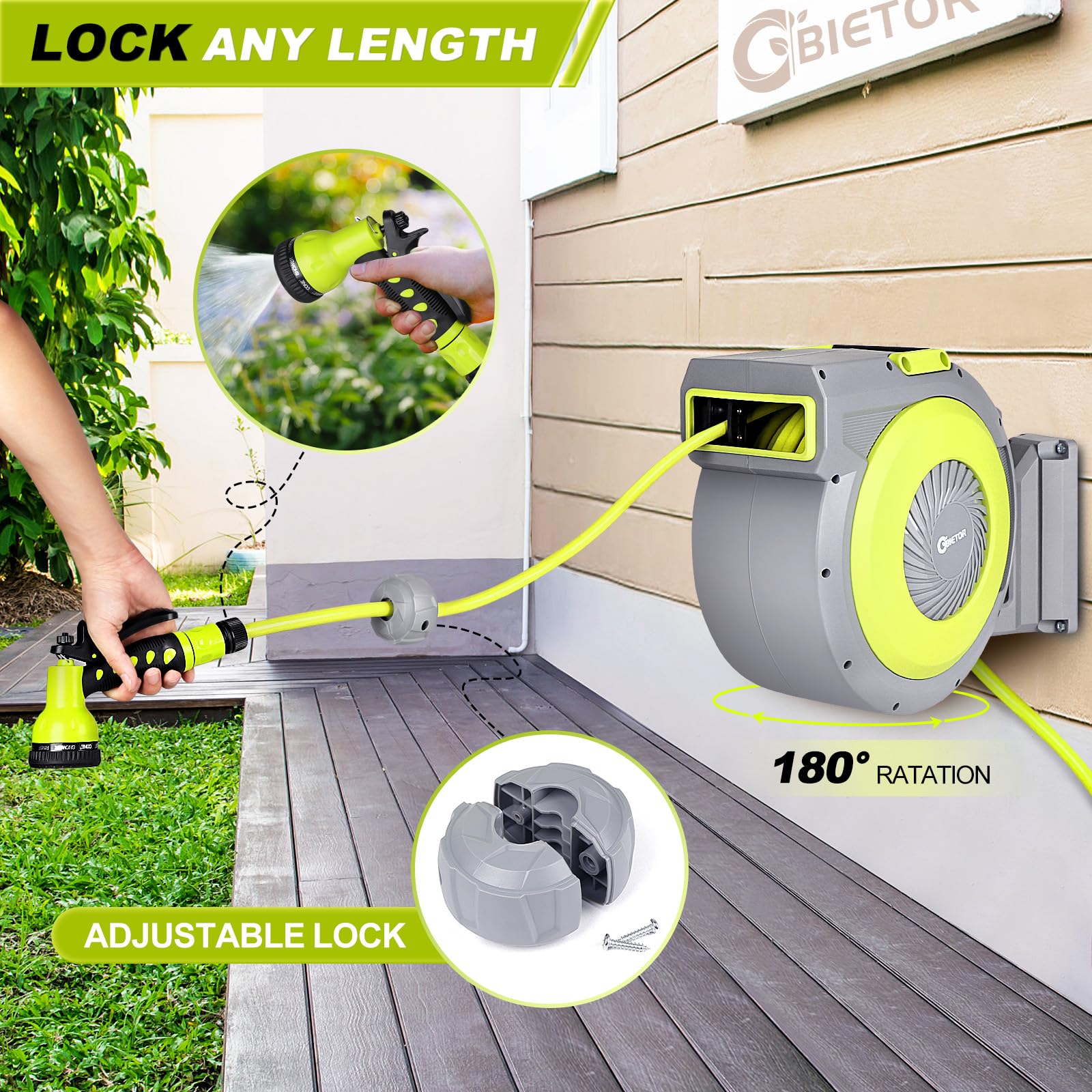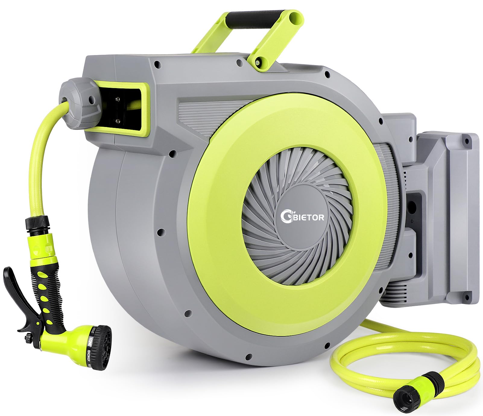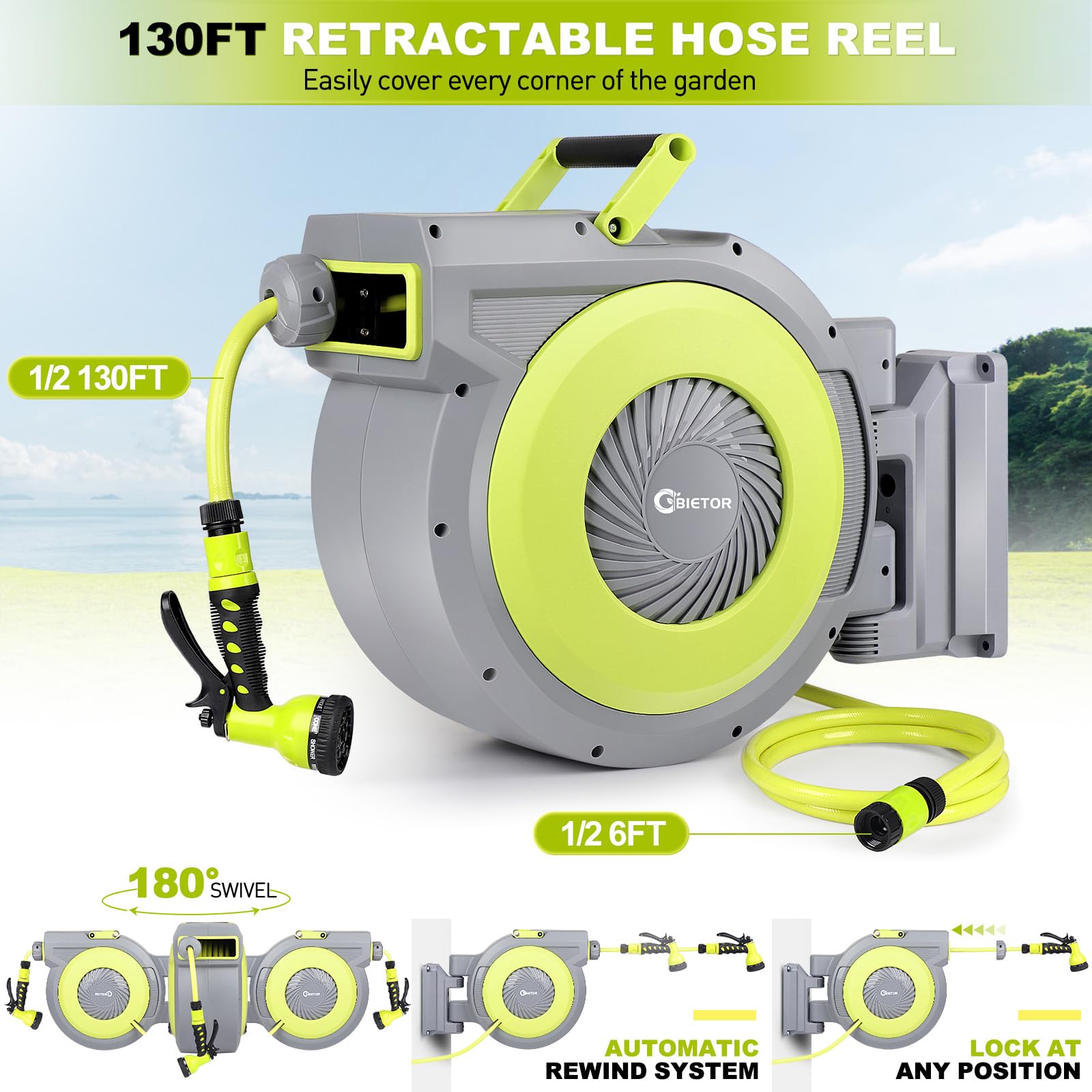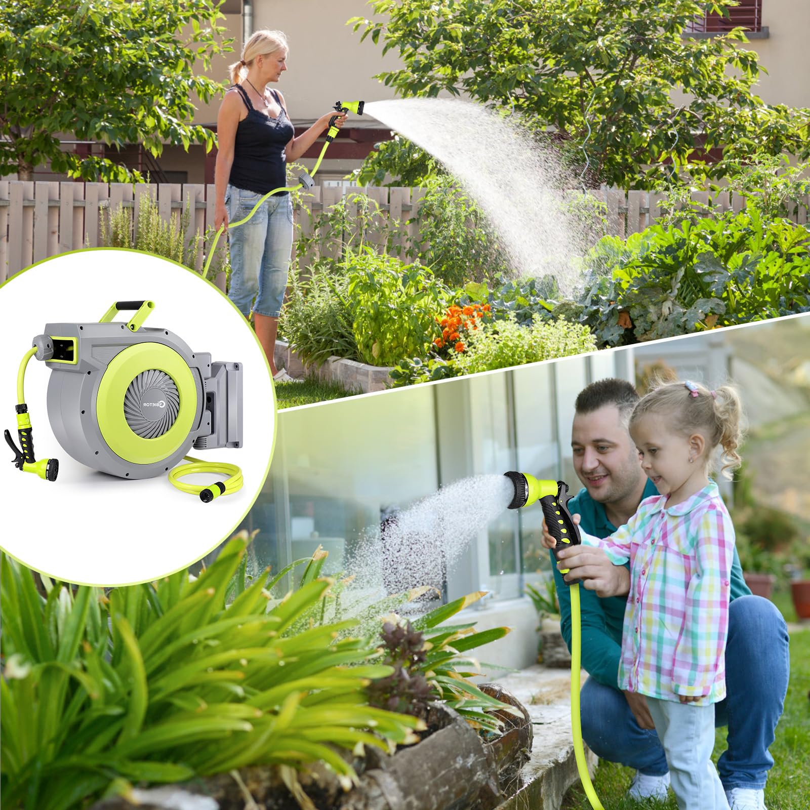 - 🏆 Automatische Aufrollung mit sanftem Rücklauf - Der Schlauch wird mühelos und gleichmäßig aufgerollt – kein Bücken oder Ziehen mehr! Das langsame Rücklaufsystem schont den Schlauch und verhindert Verknotungen.