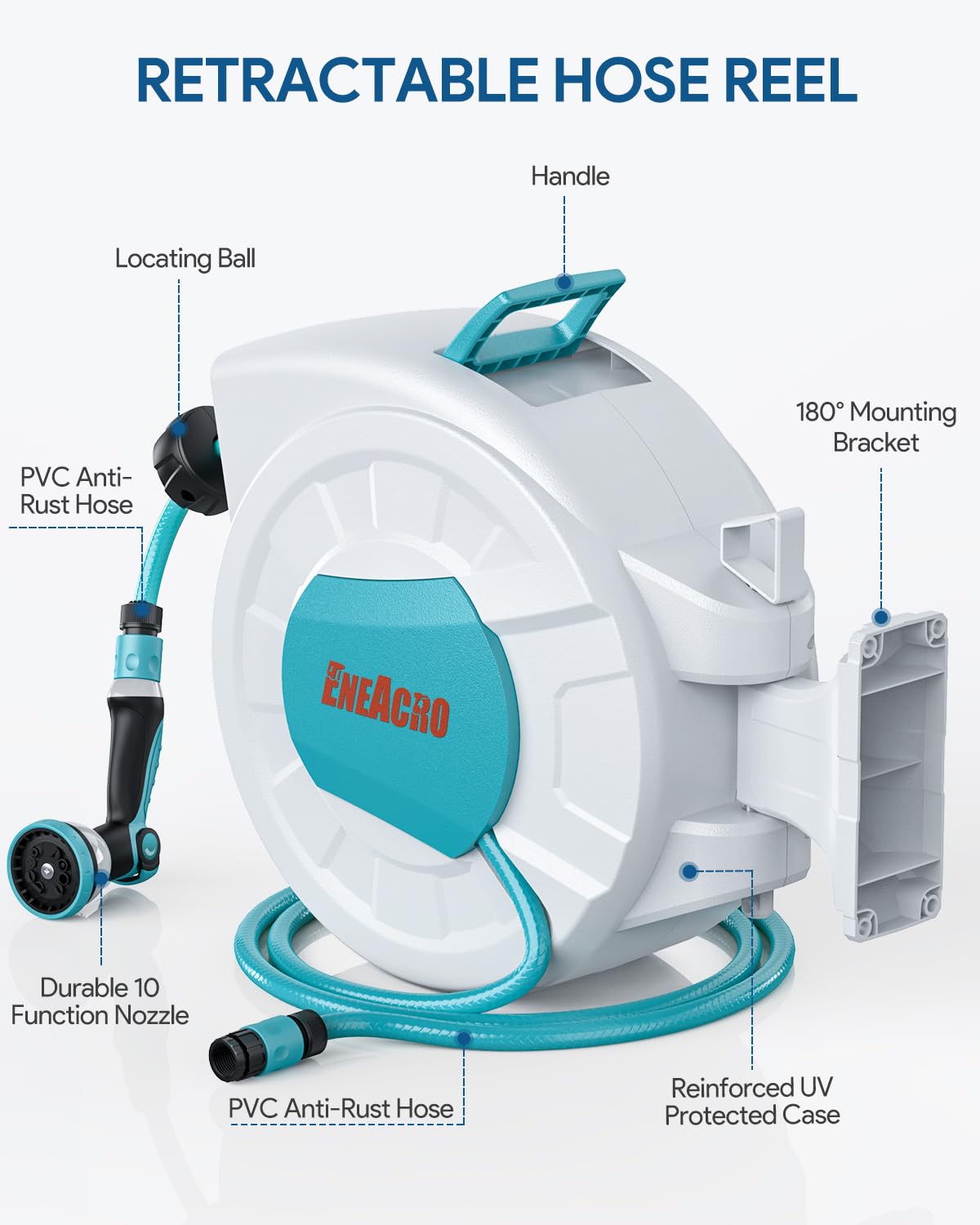 ENEACRO Schlauchbox 30m Wandmontage - Automatik-Aufrollung, 180° schwenkbar, 10-in-1 Sprühdüse