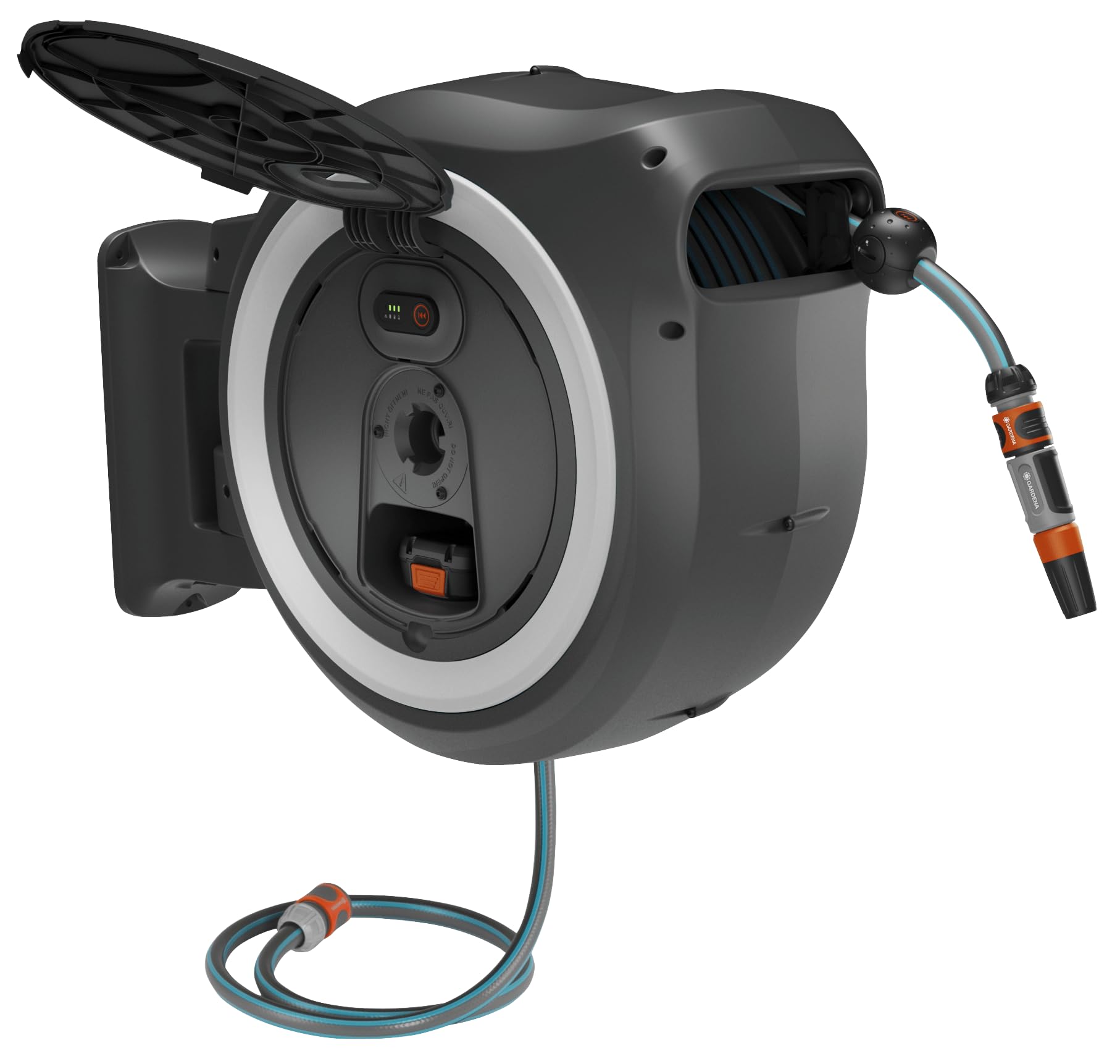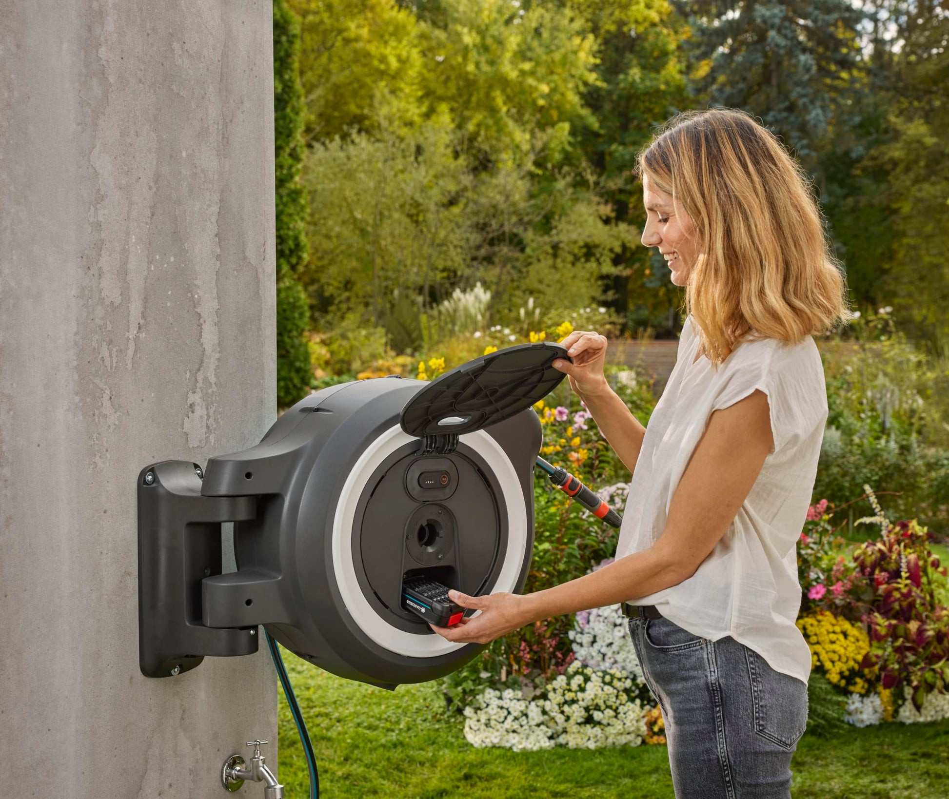 - Automatisches Aufrollen: Dank Akku wird der 40 m Wasserschlauch automatisch per Knopfdruck eingezogen, RollControll+ und Schlauchführung sorgen für einen kontrollierten Einzug ohne Verwicklungen