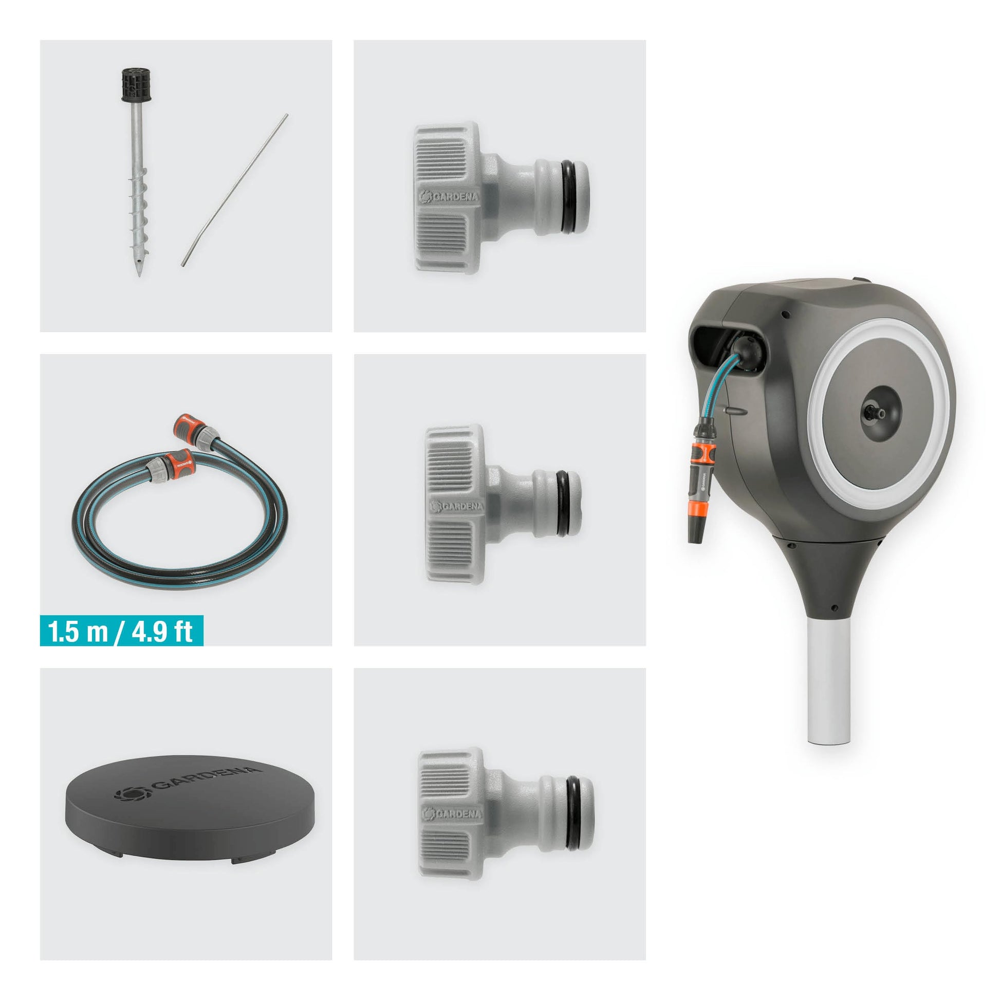- RollControl-Technologie: Automatisches, sicheres und zuverlässiges Aufrollen dank eingebauten Arretierstops – mit integrierter Schlauchführung, für einen gleichmäßigen Einzug ohne verknoten oder abknicken