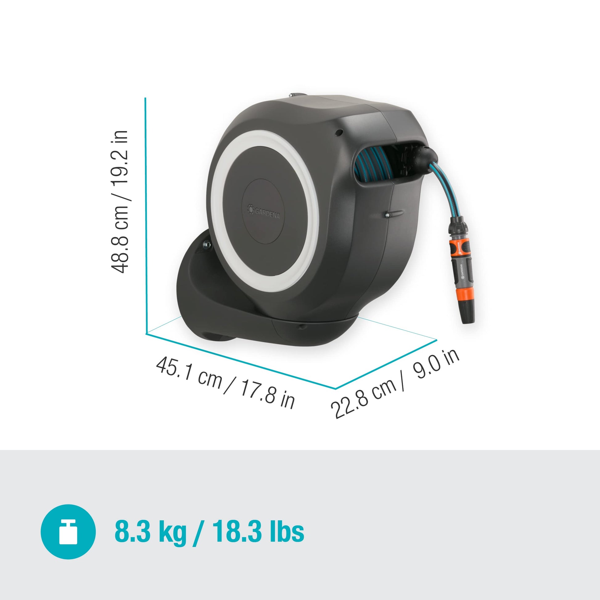 Gardena RollUp Wand-Schlauchbox M – die ideale Lösung für mittelgroße Gärten und Terrassen | Die automatische Gardena RollUp bietet höchsten Komfort bei der Gartenbewässerung. Einfach an einer Wand montiert, erspart sie Ihnen so lästiges Bücken und Kurbeln. Dank RollControl genügt ein kurzer Zug am Schlauch und er wird mit gleichmäßiger Geschwindigkeit und sicher automatisch wieder aufgerollt. Die Wandhalterung ist um mehr als 180 Grad schwenkbar, mit praktischer Halterung zum Aufbewahren von Gardena Spritzen oder Brausen. Mit den kurzen Arretierstops kann der Schlauch einfach auf die gewünschte Länge ausgezogen werden und rollt sich bei Bedarf selbst wieder ein. Die Gardena Wand-Schlauchboxen RollUp ist sowohl UV- als auch frost- und Diebstahlsicher. Hochwertige Gardena Zubehör inklusive | Mit der Schlauchbox werden zusätzlich einen 20 m Gardena Qualitätsschlauch (Durchmesser 11 mm, 1/2 Zoll) sowie eine Spritze mit zwei verschiedenen Sprühstrahloptionen, die Wandhalterung und alle benötigten Original Gardena System- und Montageteile mitgeliefert und machen die Schlauchbox somit sofort einsatzbereit.