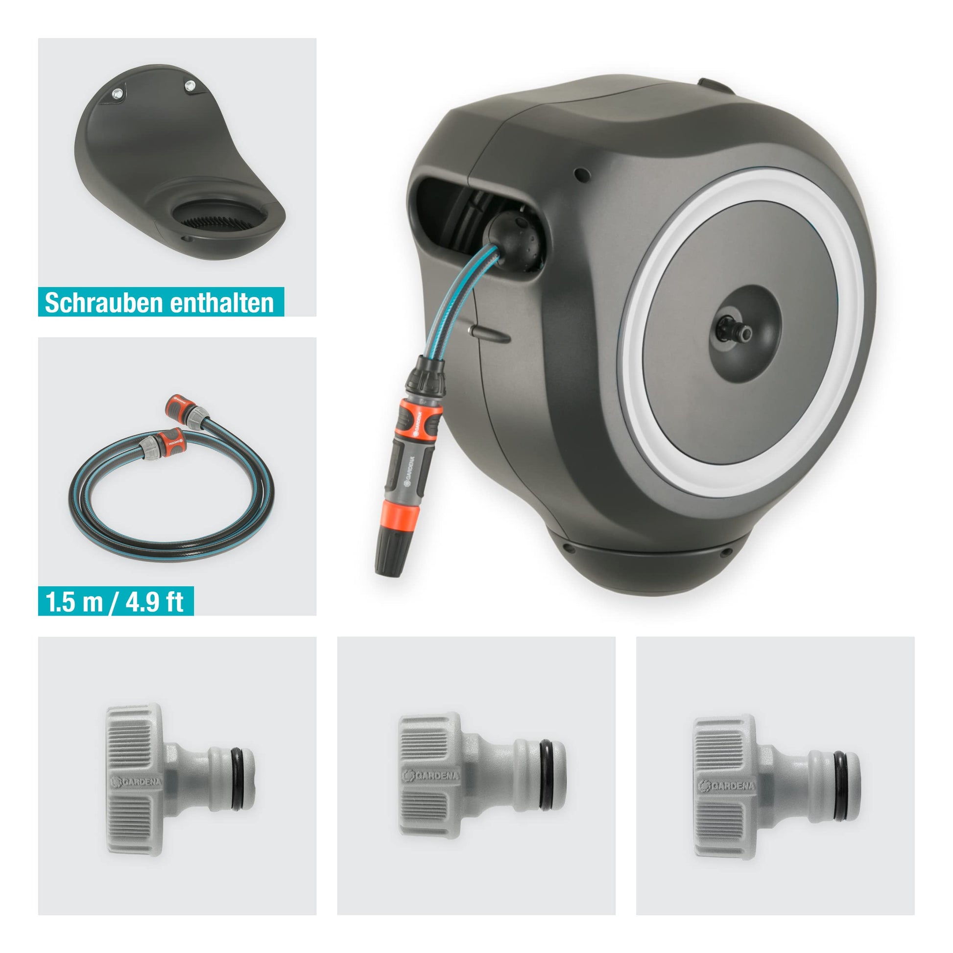 - Lieferumfang beinhaltet: 1x Gardena Wand-Schlauchbox, 1x 20 m Gardena Qualitätsschlauch (11 mm), 1x Anschlussschlauch, 1x Spritze, 1x Wandhalterung mit Schrauben, Dübeln und Montagehilfe