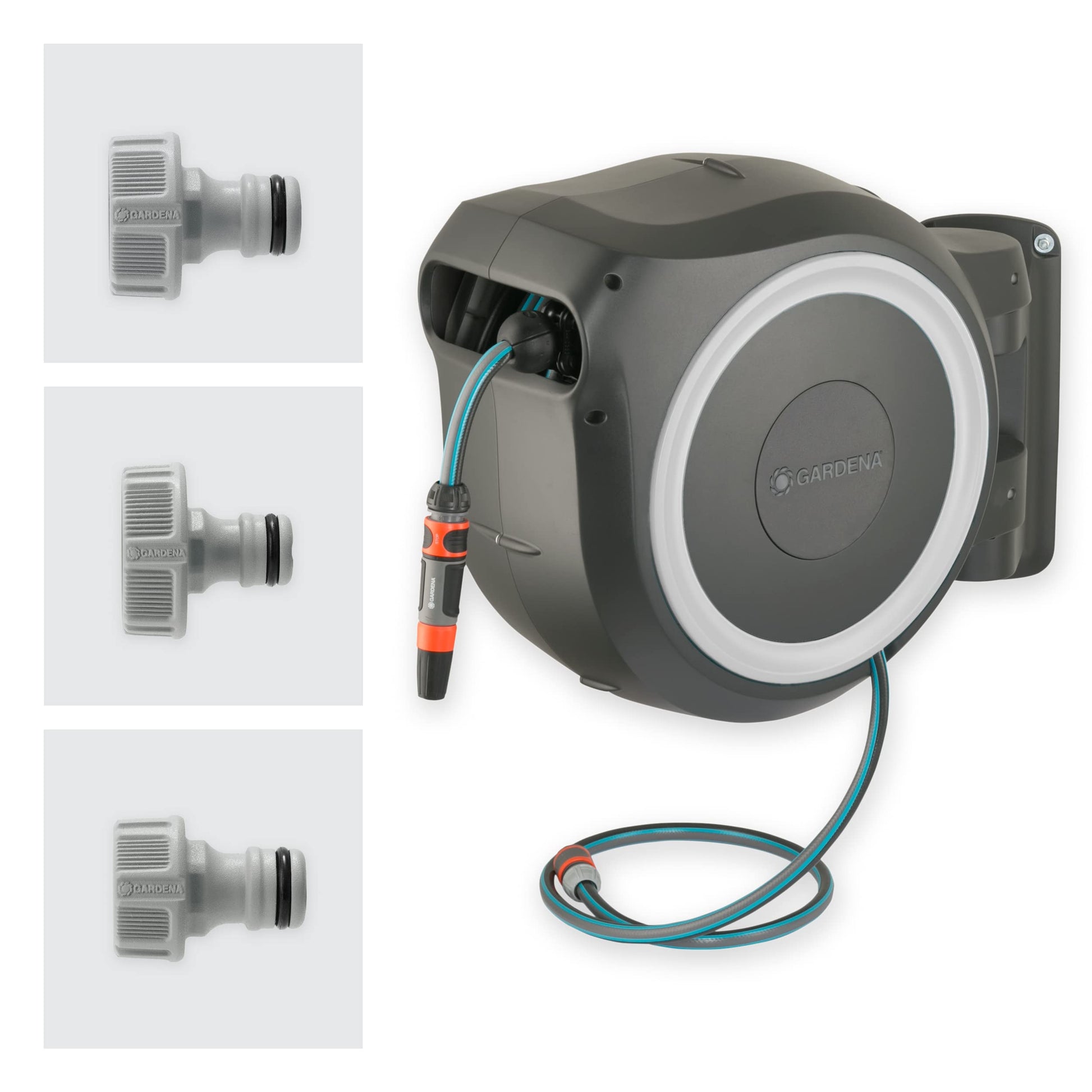 - Lieferumfang beinhaltet: 1x Gardena Wand-Schlauchbox, 1x 35 m Gardena Qualitätsschlauch (13 mm), 1x Anschlussschlauch, 1x Spritze, 1x Wandhalterung mit Schrauben, Dübeln und Montagehilfe