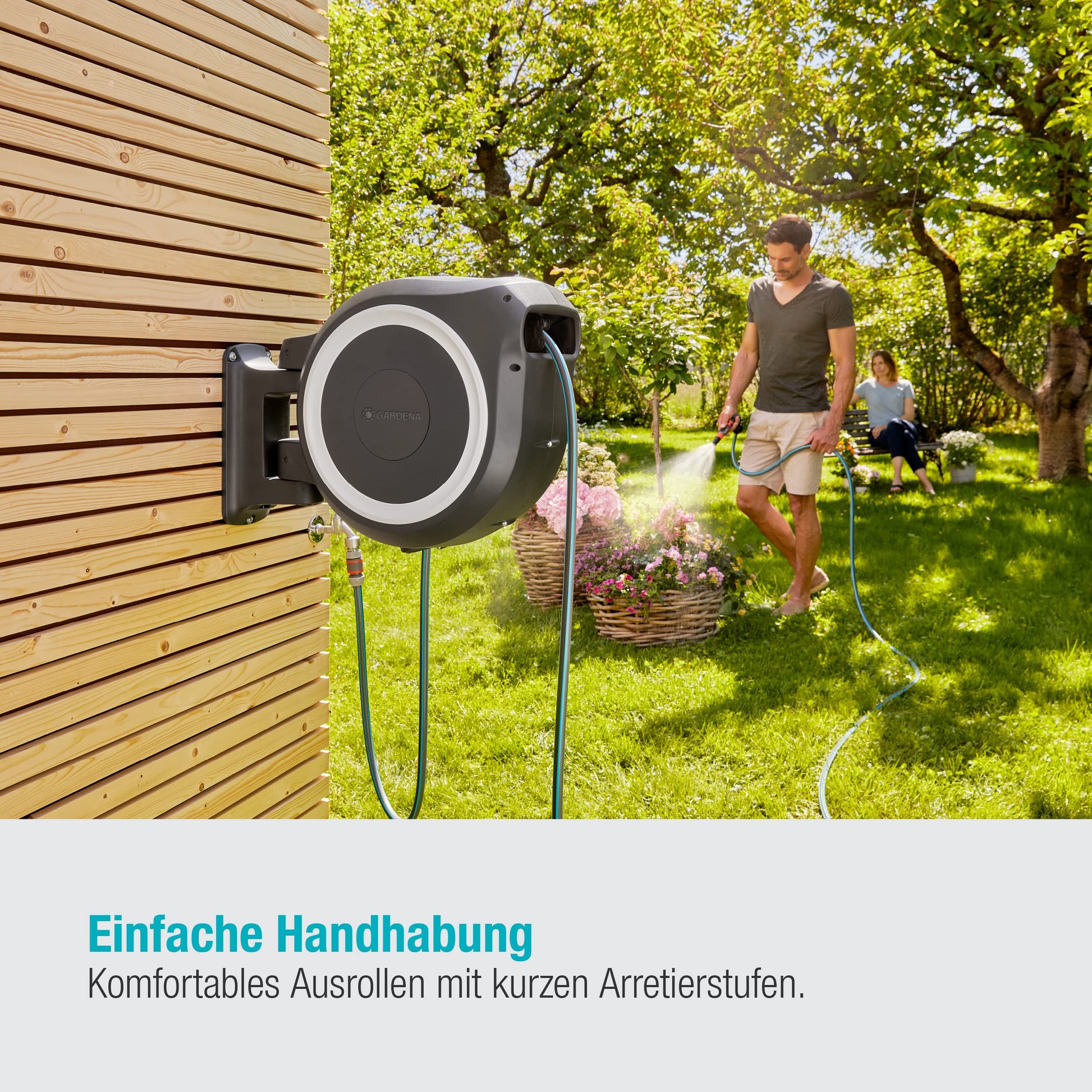 Gardena RollUp Wand-Schlauchbox XL – die ideale Lösung für große Gärten und Terrassen | Die automatische Gardena RollUp bietet höchsten Komfort bei der Gartenbewässerung. Einfach an einer Wand montiert, erspart sie Ihnen so lästiges Bücken und Kurbeln. Dank RollControl genügt ein kurzer Zug am Schlauch und er wird mit gleichmäßiger Geschwindigkeit und sicher automatisch wieder aufgerollt. Die Wandhalterung ist um mehr als 180 Grad schwenkbar, mit praktischer Halterung zum Aufbewahren von Gardena Spritzen oder Brausen. Mit den kurzen Arretierstops kann der Schlauch einfach auf die gewünschte Länge ausgezogen werden und rollt sich bei Bedarf selbst wieder ein. Die Gardena Wand-Schlauchboxen RollUp ist sowohl UV- als auch frost- und Diebstahlsicher. Hochwertige Gardena Zubehör inklusive | Mit der Schlauchbox werden zusätzlich einen 35 m Gardena Qualitätsschlauch (Durchmesser 13 mm, 1/2 Zoll) sowie eine Spritze mit zwei verschiedenen Sprühstrahloptionen, die Wandhalterung und alle benötigten Original Gardena System- und Montageteile mitgeliefert und machen die Schlauchbox somit sofort einsatzbereit.