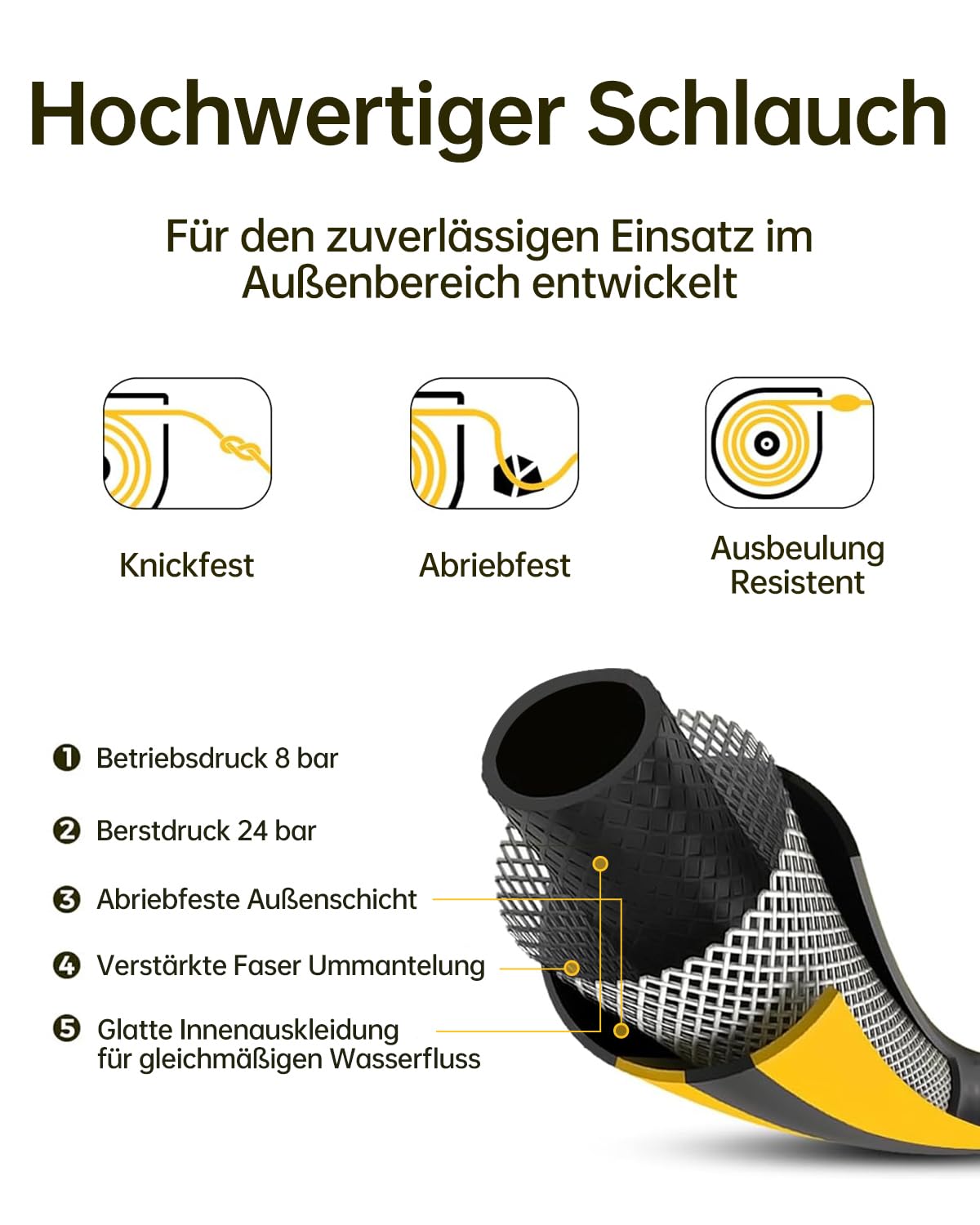 - Platzdruckbeständiger Schlauch: Der Schlauch dieser Außenschlauchtrommel besteht aus 3-lagigem PVC mit verstärktem Fasergeflecht und wurde auf einen Berstdruck von 24 Bar getestet (3-fache des 8 Bar Arbeitsdrucks). Dieser Sicherheitsfaktor sicher, dass es für über 2 Jahre keine Lecks oder Berstgefahr gibt.
