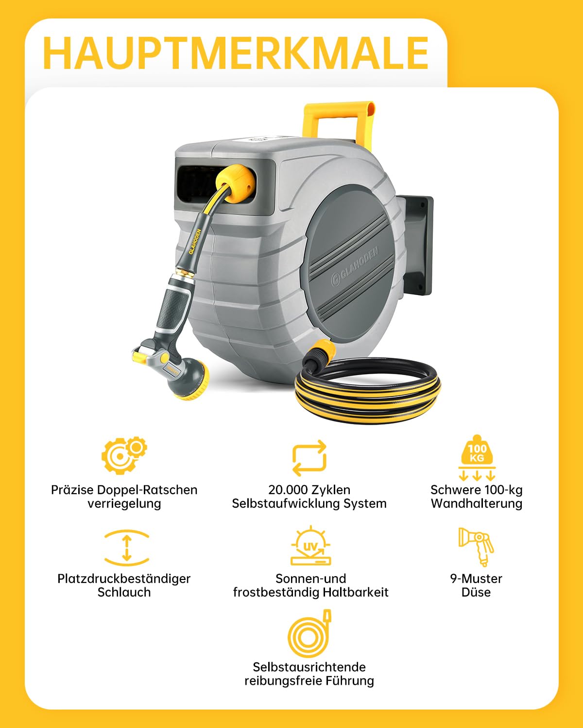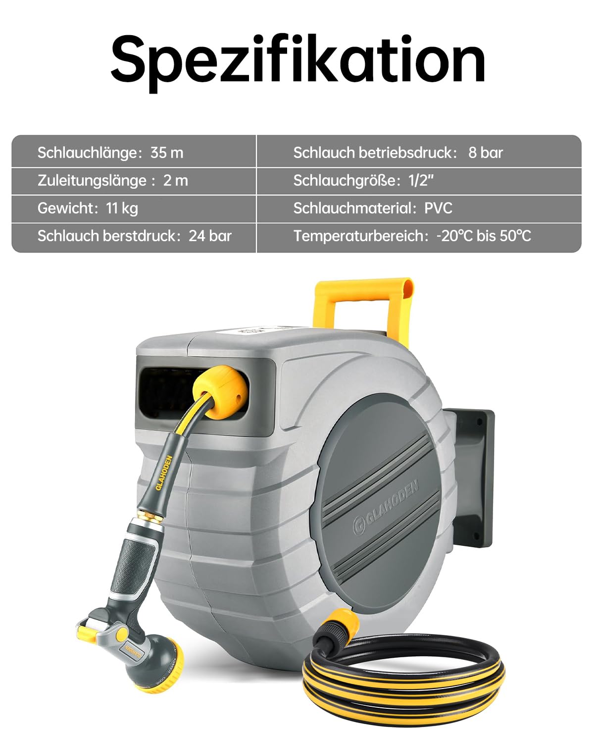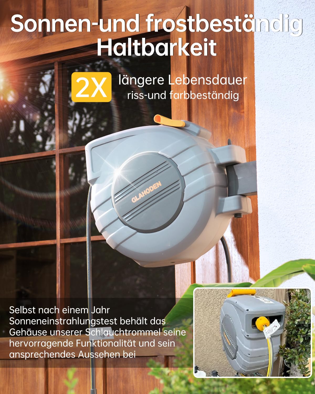 GLAHODEN Schlauchtrommel 35m Wandmontage - Frostbeständig, Längenverriegelung, 9-Funktionen-Düse