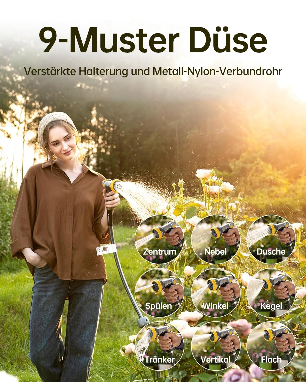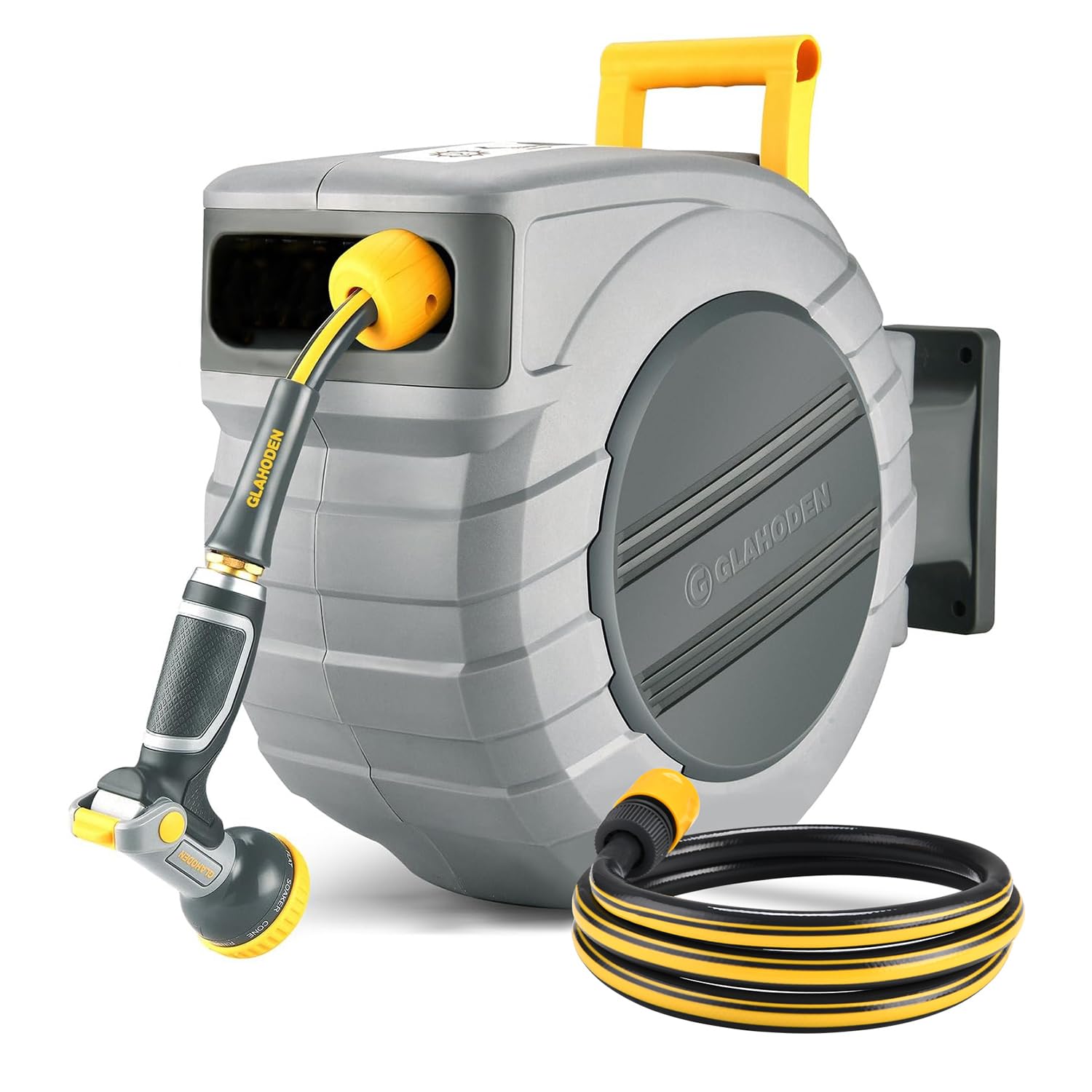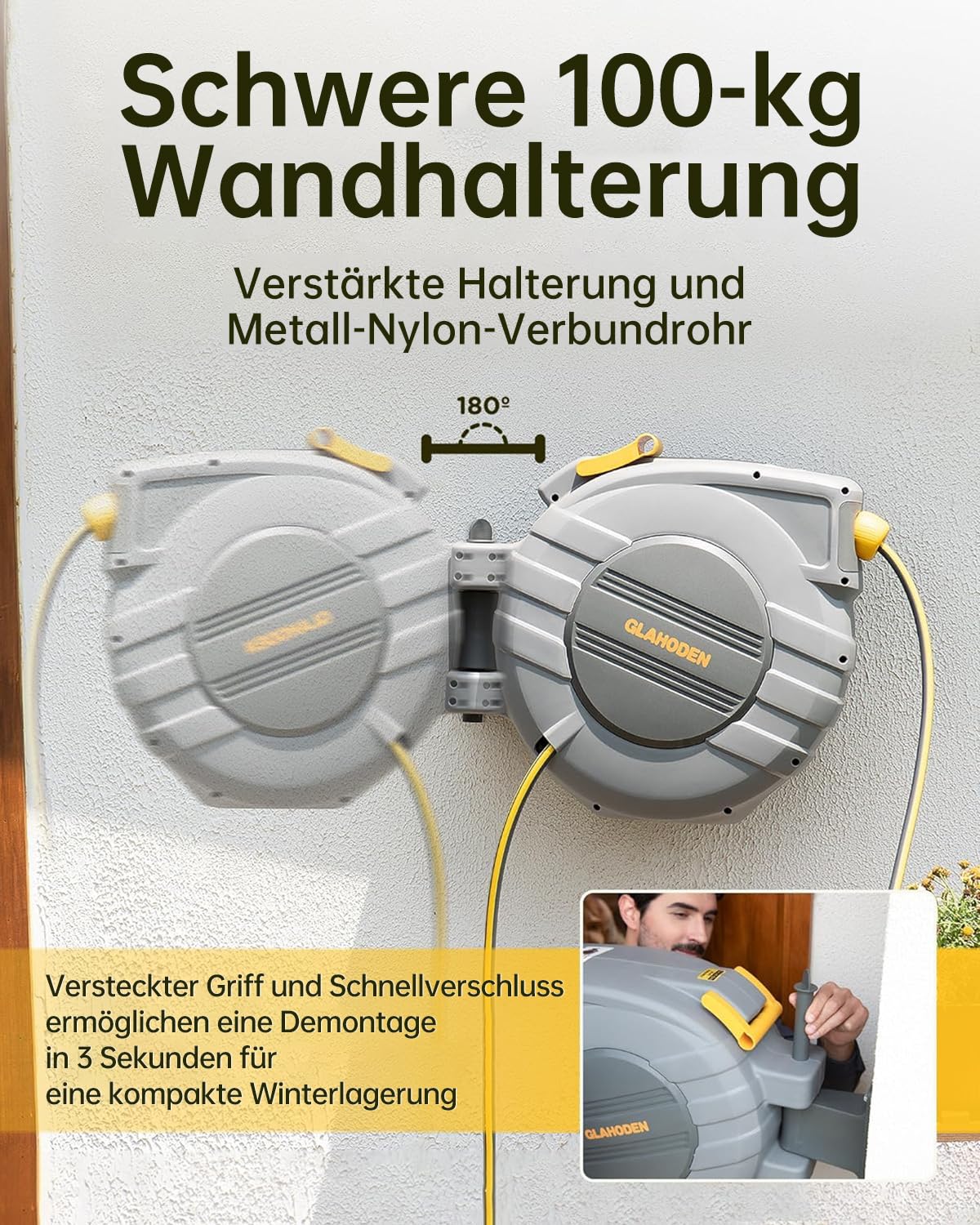 GLAHODEN Schlauchtrommel 35m Wandmontage - Frostbeständig, Längenverriegelung, 9-Funktionen-Düse
