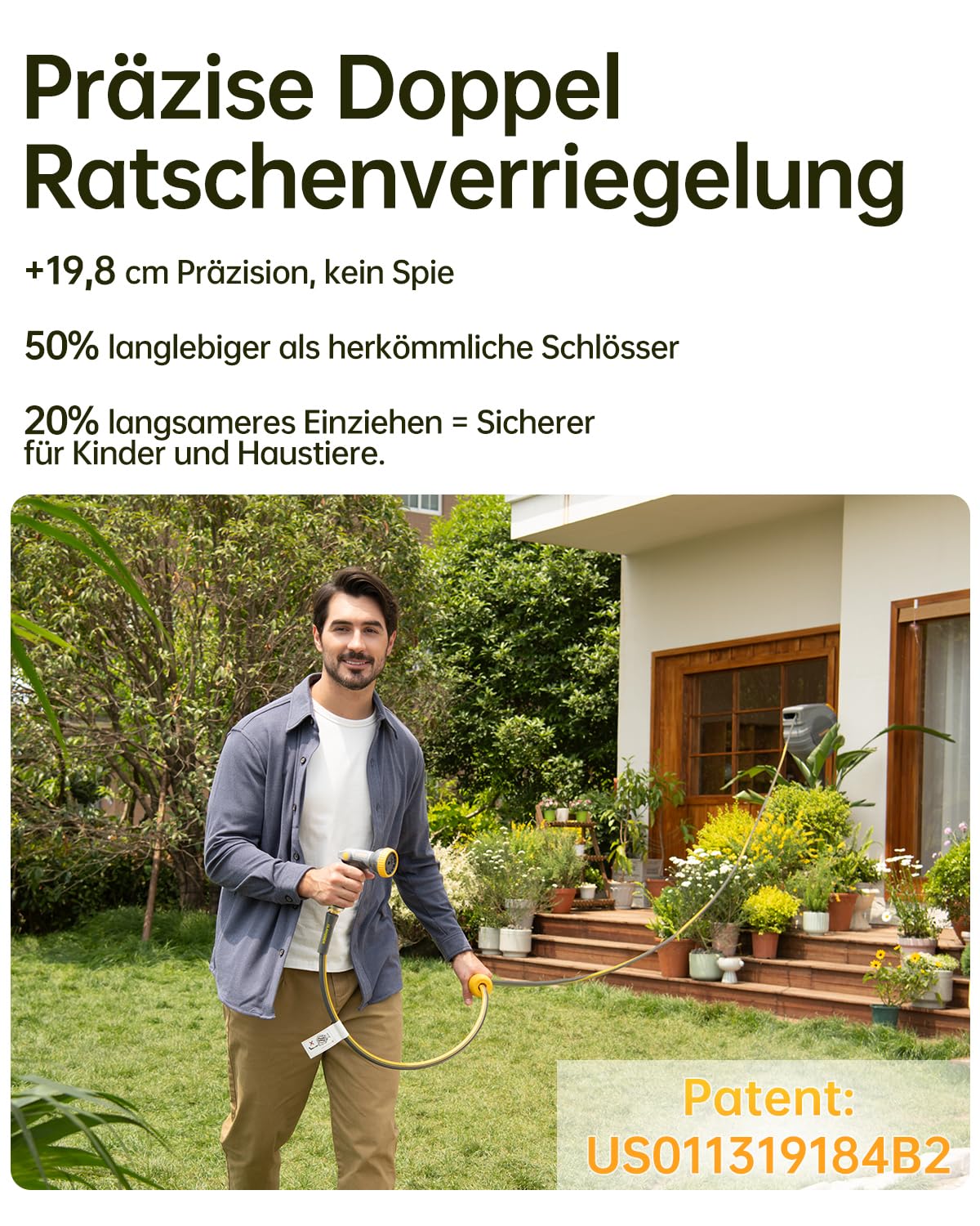 - Präzise Doppel-Ratschenverriegelung (Patent: US011319184B2): Die automatische Schlauchtrommel von GLAHODEN besteht 3.000 strenge Tests mit einer Verriegelungsgenauigkeit von ±19,8 cm. 50% langlebiger als herkömmliche Verriegelungen, verhindert sie Schlauchdurchhang und sichert präzise Längen, um eine genaue Positionierung an Balkonecken oder Gartenrändern zu gewährleisten, ohne überschüssigen Schlauch hinter sich herzuziehen.